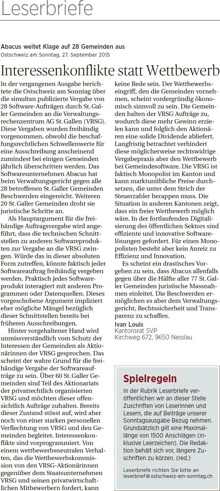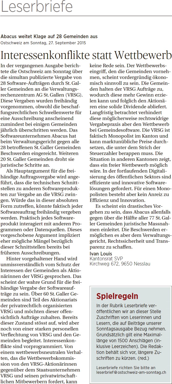 Leserbrief zu „Abacus weitet Klage auf 28 Gemeinden aus“ von Regula Weik in der Ostschweiz am Sonntag vom 27. September 2015: