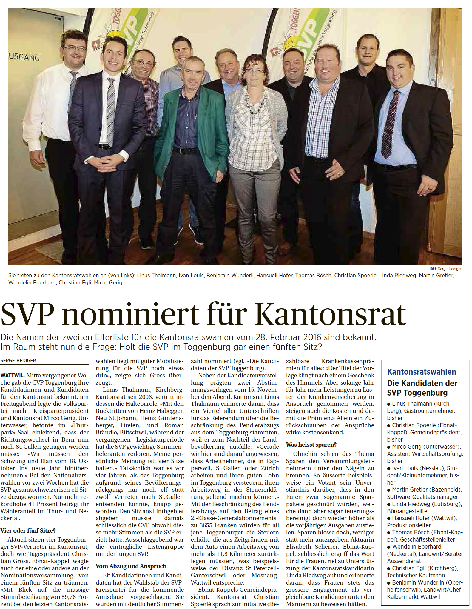 Elf Kandidatinnen und Kandidaten hat der Wahlstab der SVP-Kreispartei für die kommende Amtsdauer vorgeschlagen. Sie wurden mit deutlicher Stimmenzahl nominiert (vgl. «Die Kandidaten der SVP Toggenburg).